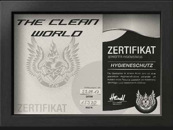 Wir sind Vorreiter im Bereich Hygiene und scheuen deshalb keine Kosten und Mühen, um für unsere Kunden den bestmöglichen Schutz zu garantieren. Deshalb benutzen wir "The Clean World" und sind Zertifiziert.